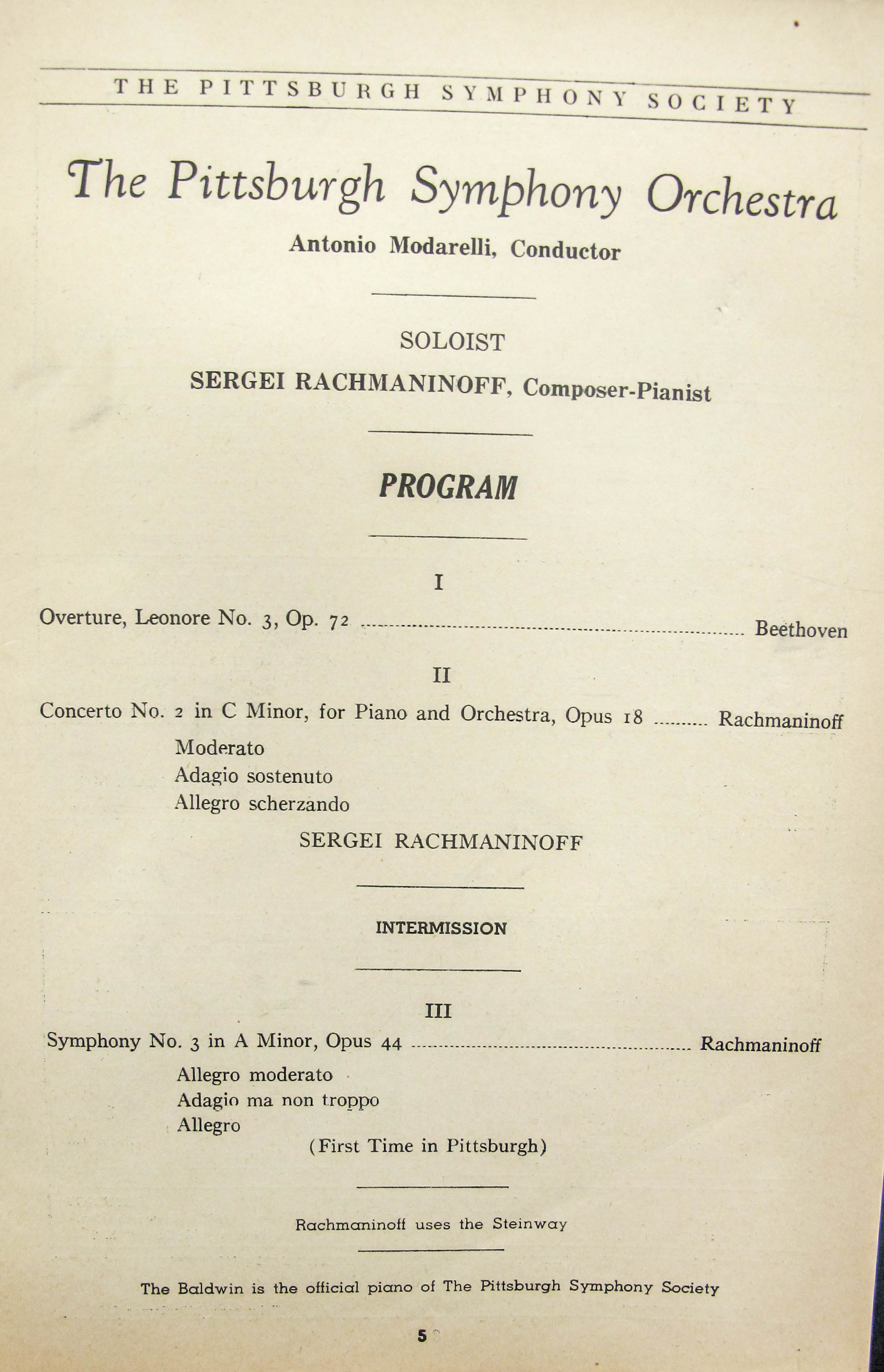 The attached reviews note that, atypically, Rachmaninoff played an encore after the concerto, performing the Prelude in C sharp minor, op. 3, no. 2. LoC, Sergei Rachmaninoff Archive, ML31.R33, Papers of Sophie Satin, boxes 82-89.