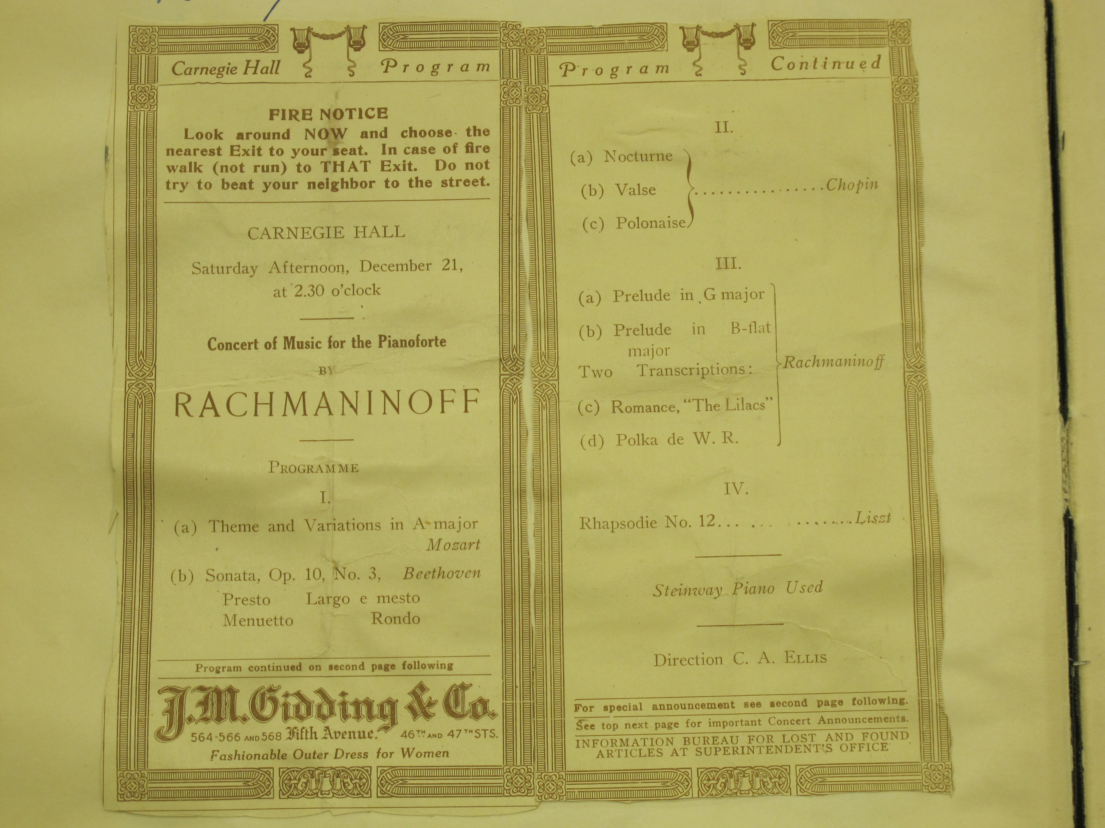 The concert began at 2.30pm. The attached review notes that Beethoven's Scherzo from the Sonata in E flat major, op. 31, no. 3, was given as an encore after the Sonata. LoC, Sergei Rachmaninoff Archive, ML31.R33, Papers of Sophie Satin, boxes 82-89.