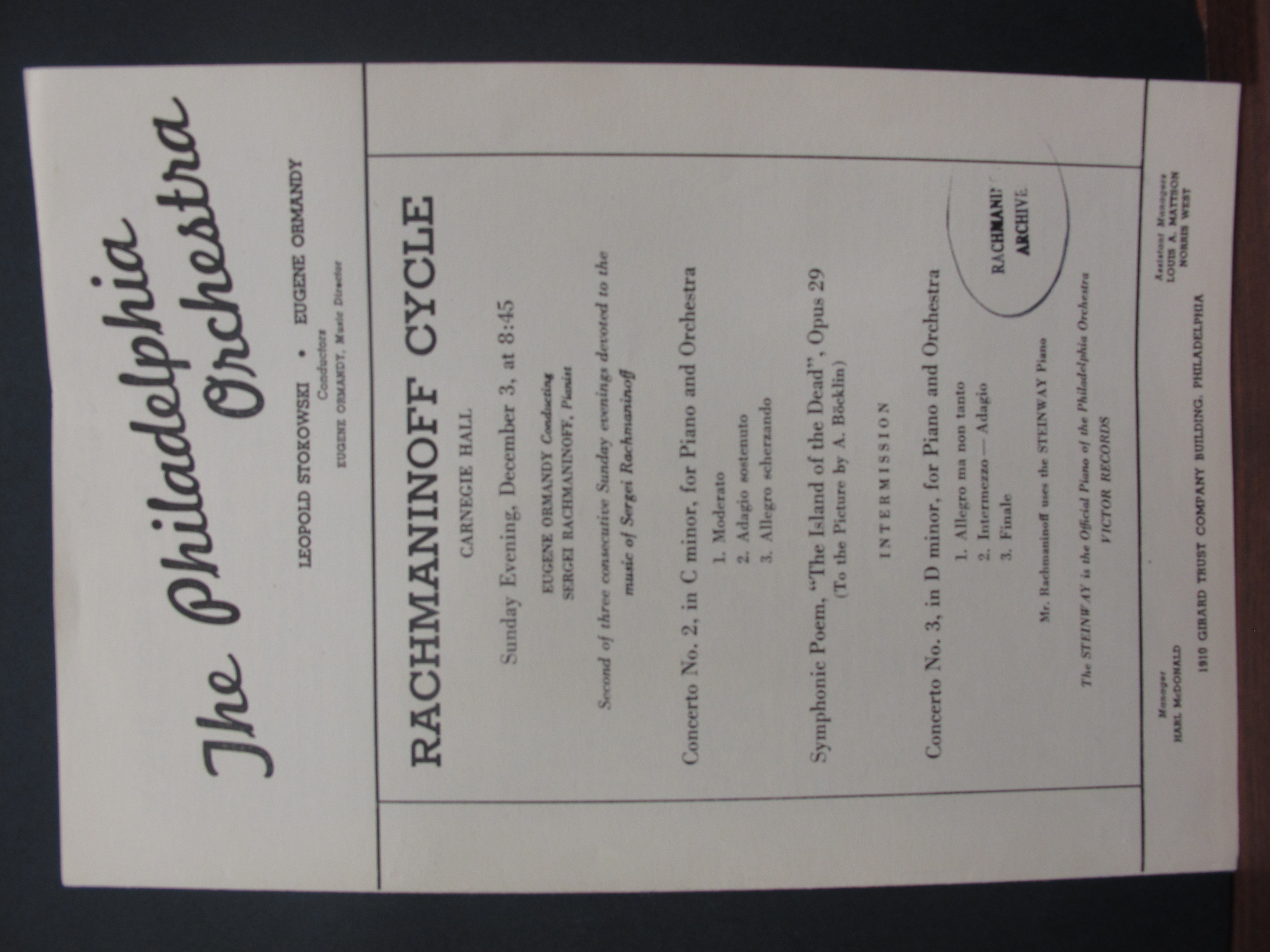 Satina notes that this was the second of three consecutive Sunday evenings devoted to Rachmaninoff’s compositions, promoted as a ‘Rachmaninoff Cycle’. LoC, Sergei Rachmaninoff Archive, ML31.R33, Papers of Sophie Satin, boxes 82-89.