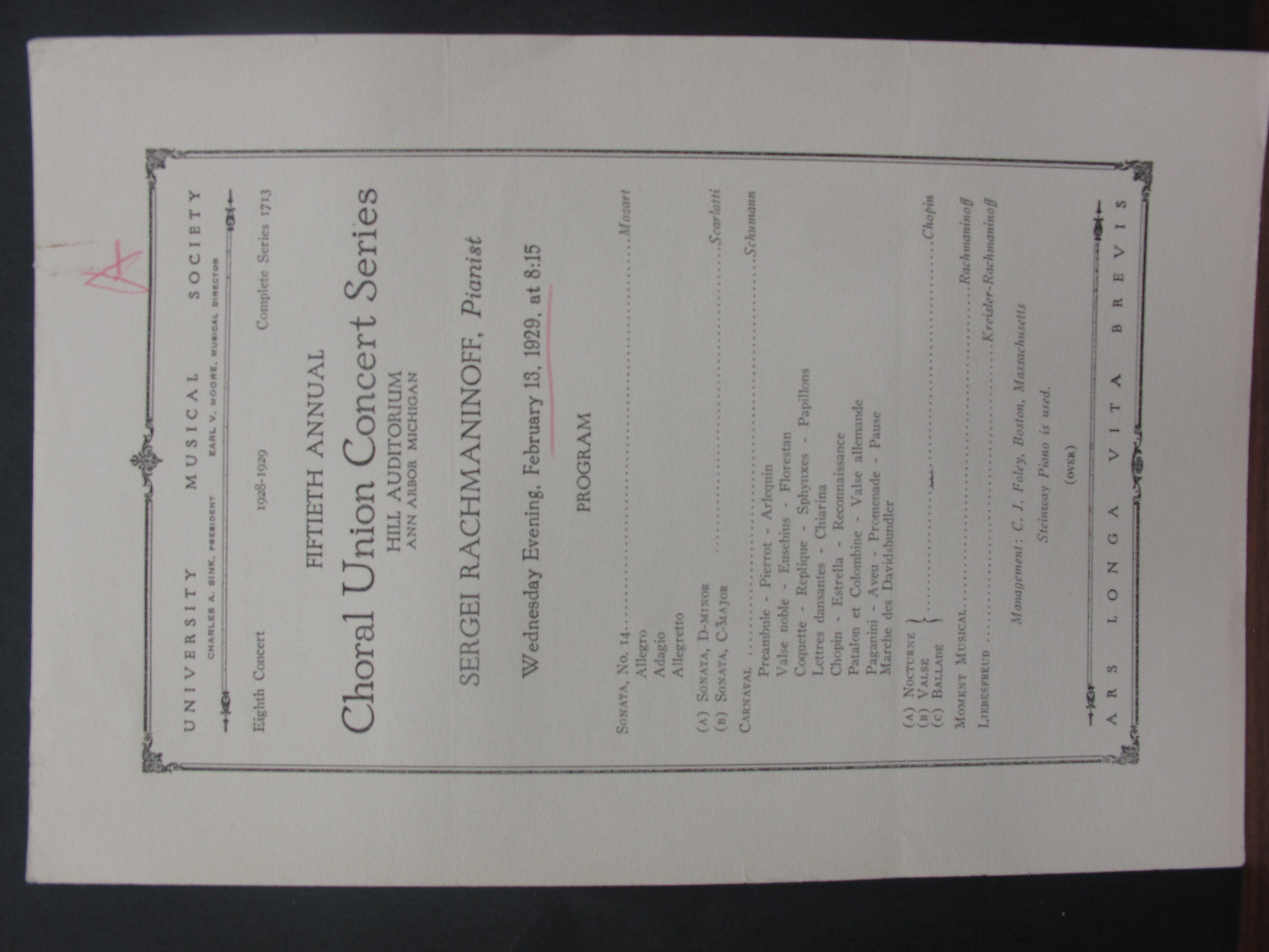 While the attached image of the program refers to 'Sonata no. 14' by Mozart, this is presumed to be a misprint as the tempo indication for the final movement clearly relates to the Sonata in D major. A similar error appears to have occurred at the concert in New York on February 16. The Scarlatti Sonata in D minor was presumably L. 413, which he recorded. As the attached review notes, the Prelude in C sharp minor, op. 3, no. 2, replaced the Moment musical, op. 16, advertised in the press. Rachmaninoff's transcription of Rimsky-Korsakov's Bumble Bee and Tchaikovsky's Troika are noted as the encores. LoC, Sergei Rachmaninoff Archive, ML31.R33, Papers of Sophie Satin, boxes 82-89.