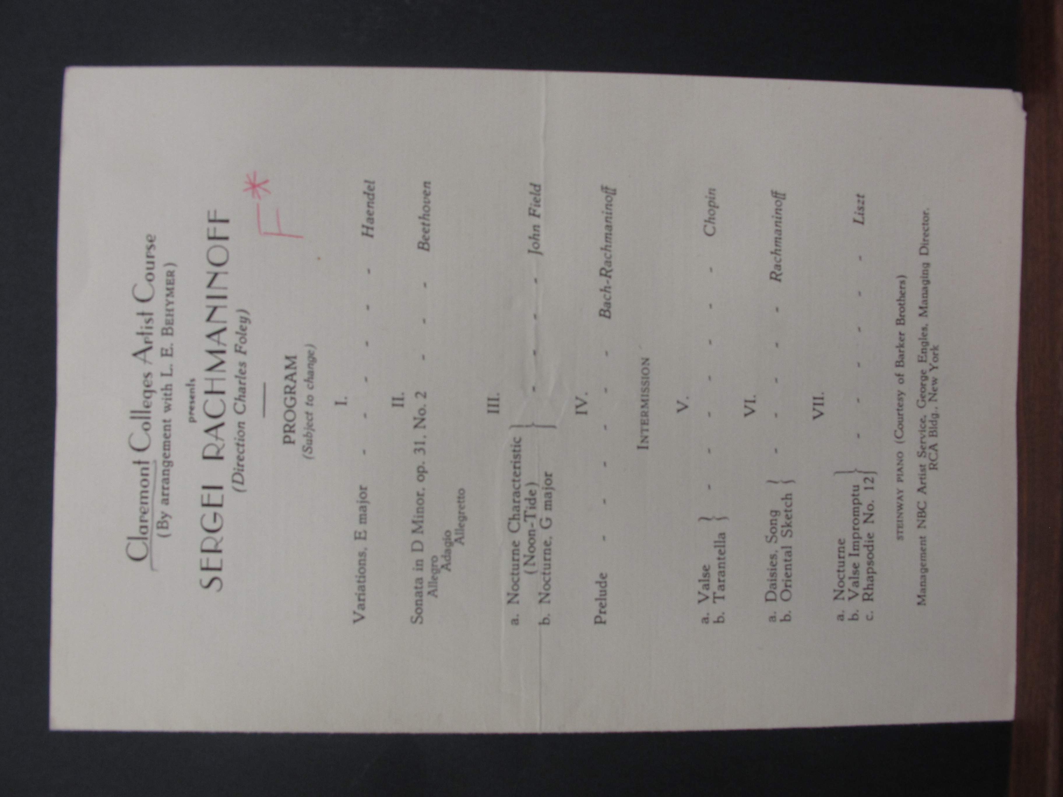 The attached review refers to Liszt's Valse impromptu, rather than the Valse oubliée which was played in other programs at the time. However, perhaps in error, the attached image of the program refers to the Valse impromptu. The Prelude in C sharp minor, op. 3, no. 2, is noted as among the encores. LoC, Sergei Rachmaninoff Archive, ML31.R33, Papers of Sophie Satin, boxes 82-89.
