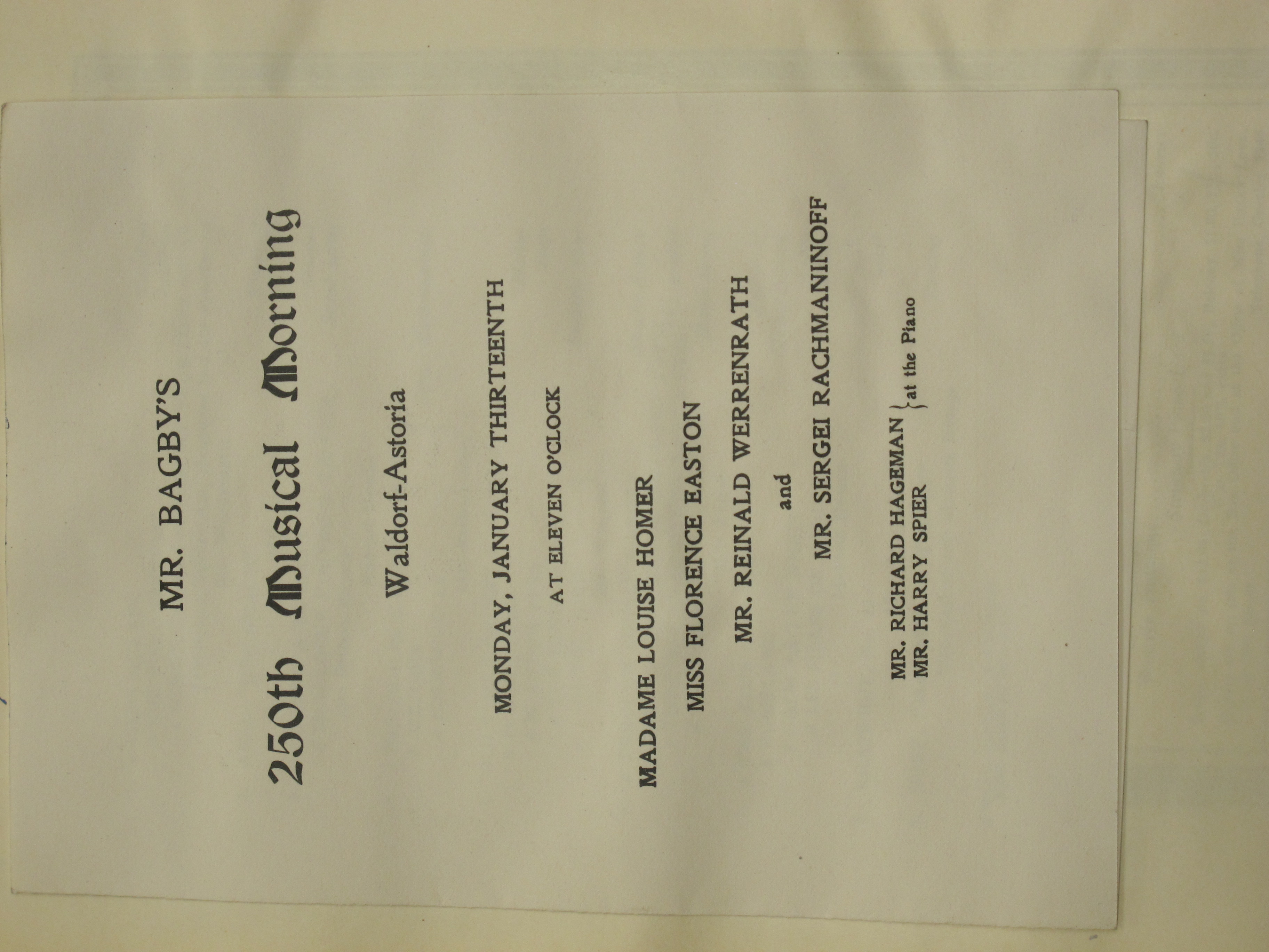 The 250th Musical Morning of Mr Bagby’s Concerts, beginning at 11am. Satina indicates that the other soloists were Louise Homer, Maria Rappold (standing in for Florence Easton), and Reinald Werrenrath. LoC, Sergei Rachmaninoff Archive, ML31.R33, Papers of Sophie Satin, boxes 82-89.