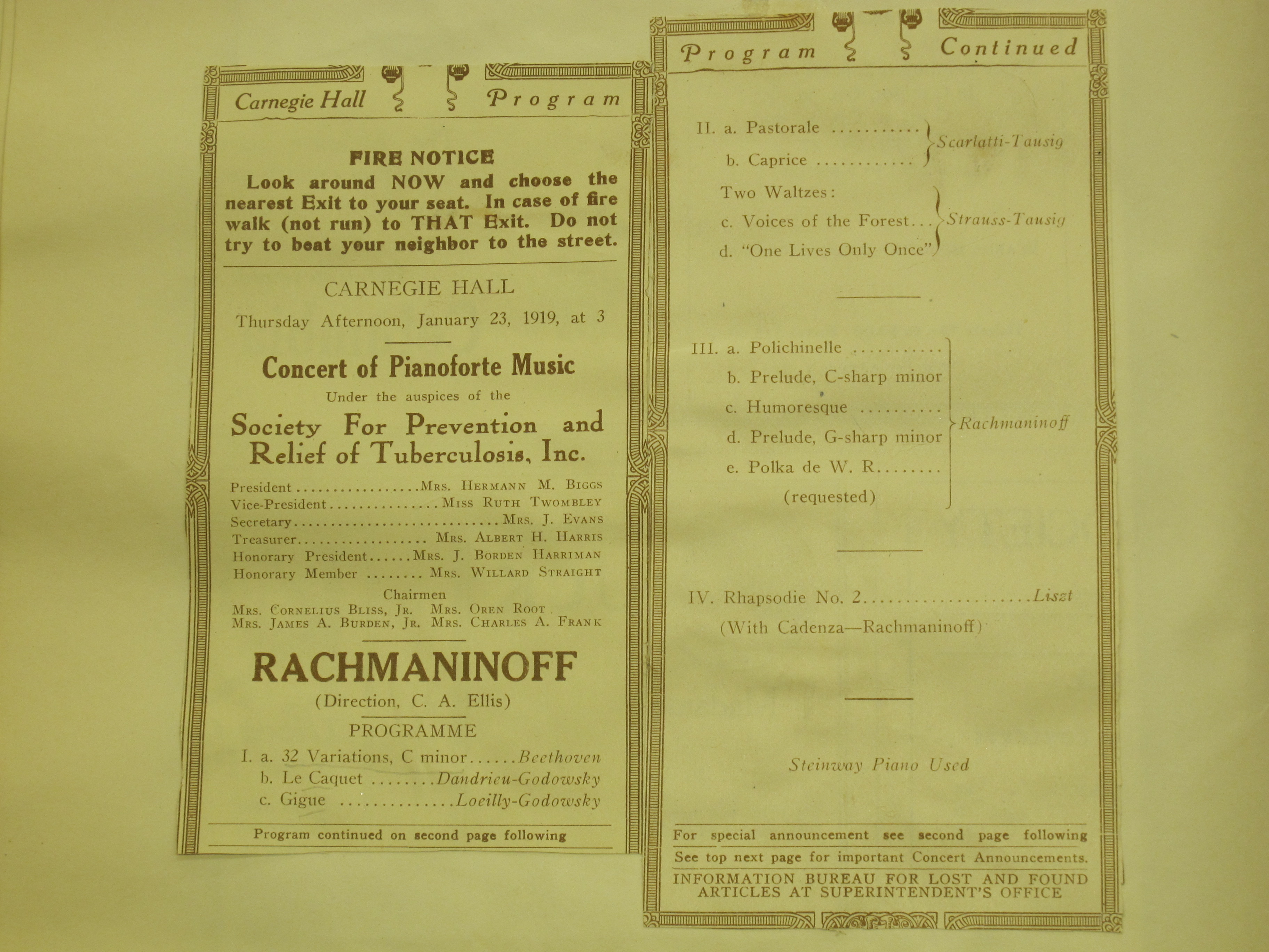 Satina notes that this was the first time the inclusion of Rachmaninoff’s cadenza was mentioned in the program, and that the Polka de W.R. was performed 'by request'. This concert was given under the auspices of the Society for Prevention and Relief of Tuberculosis. LoC, Sergei Rachmaninoff Archive, ML31.R33, Papers of Sophie Satin, boxes 82-89.