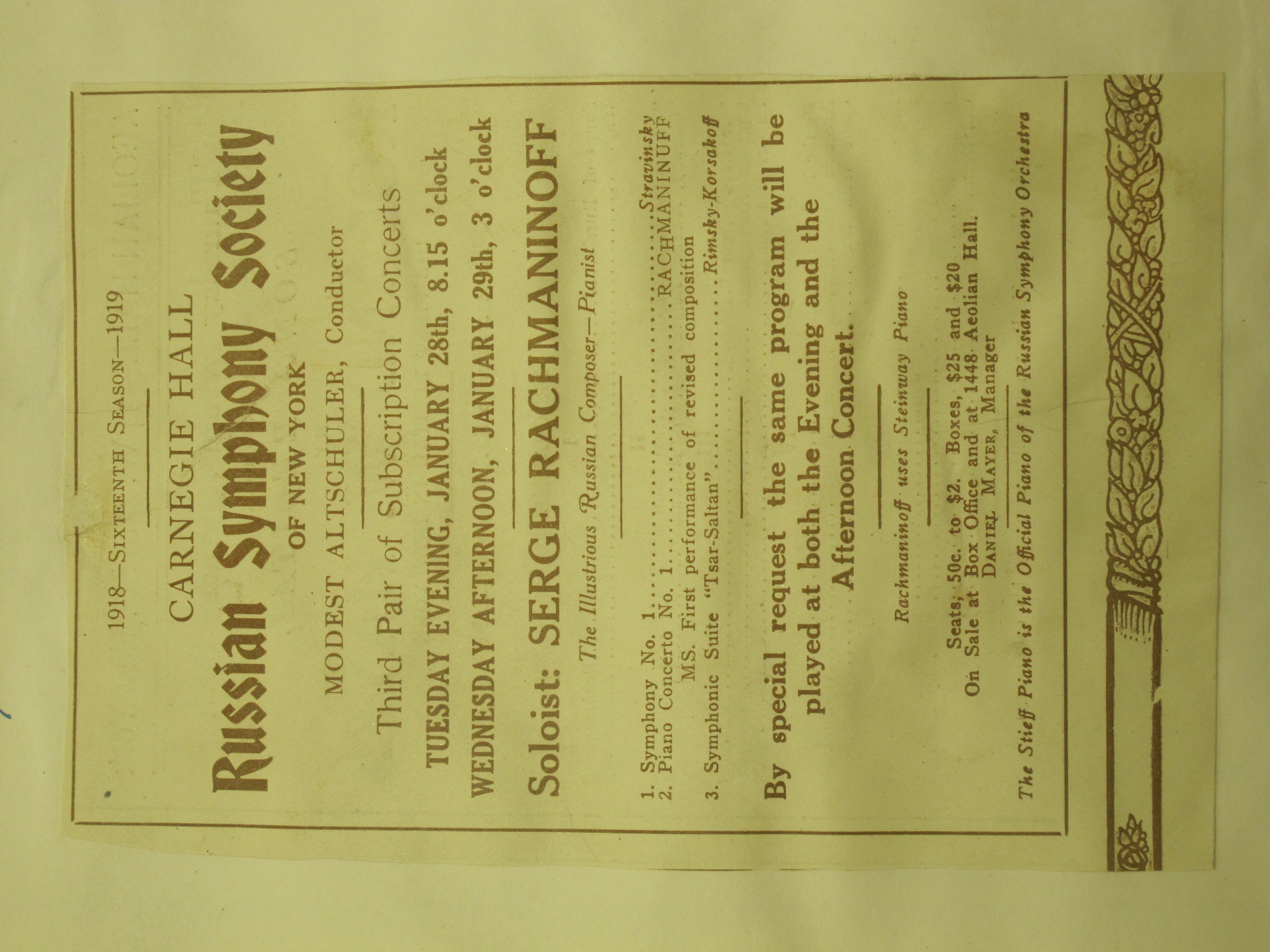 The concert began at 3pm. According to the program, the work by Scriabin was not scheduled, yet it is mentioned in the review. LoC, Sergei Rachmaninoff Archive, ML31.R33, Papers of Sophie Satin, boxes 82-89.