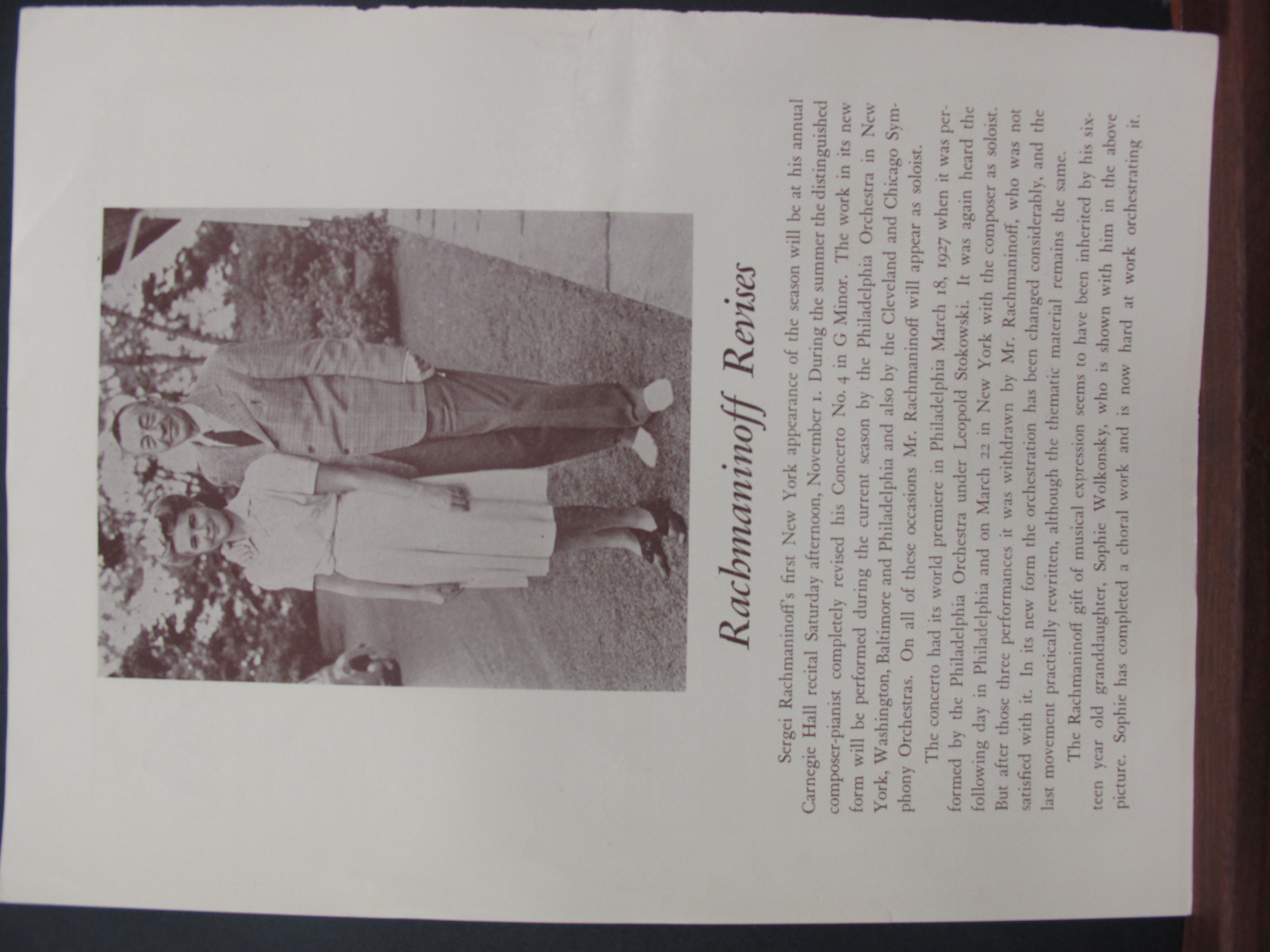 Satina notes that these were the first performances of the second revised version of Rachmaninoff’s Fourth Piano Concerto. LoC, Sergei Rachmaninoff Archive, ML31.R33, Papers of Sophie Satin, boxes 82-89.