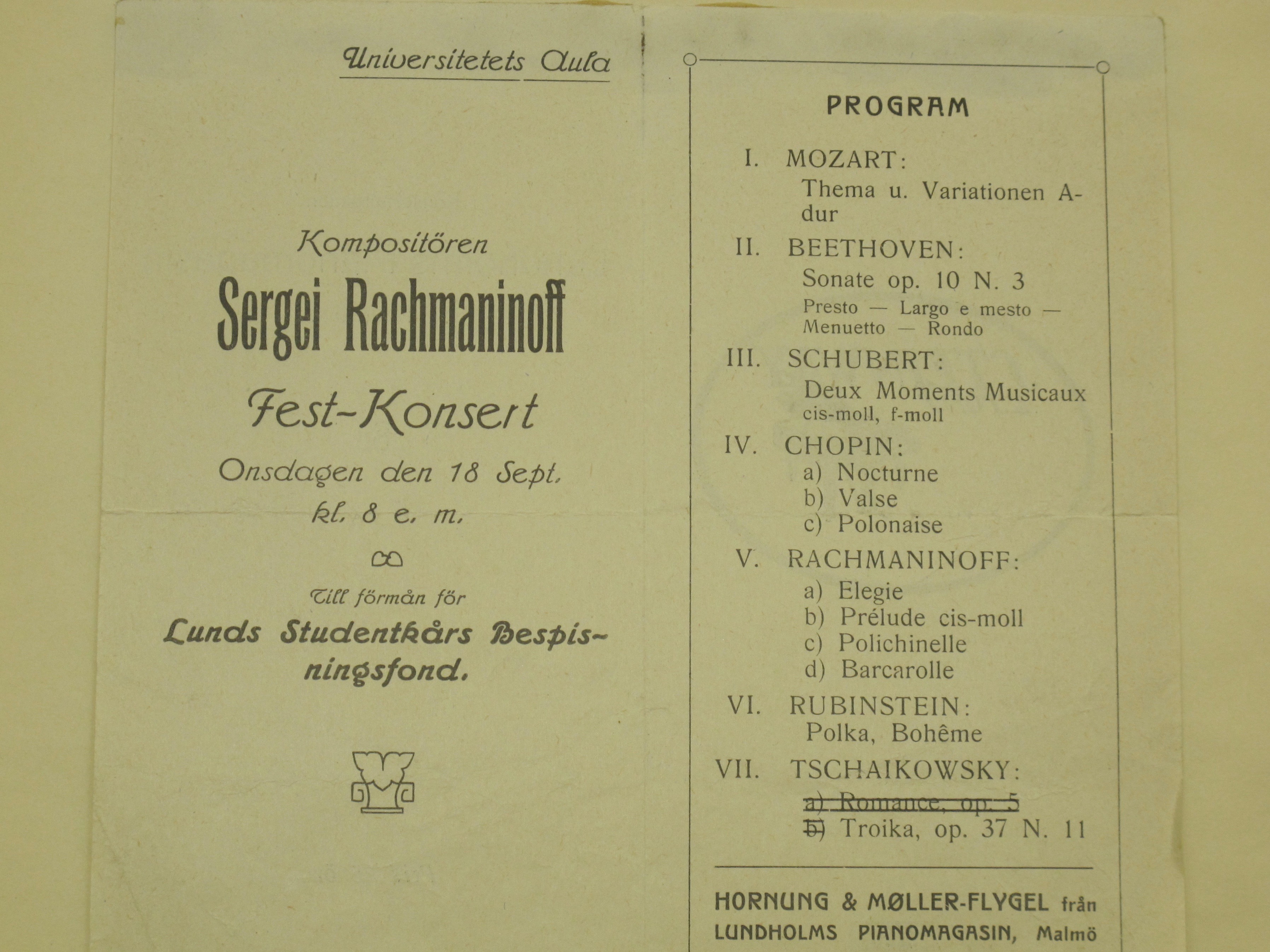 Satina indicates that Tchaikovsky’s Romance might not have been played. A piano made by Hornung & Møller is noted. LoC, Sergei Rachmaninoff Archive, ML31.R33, Papers of Sophie Satin, boxes 82-89.